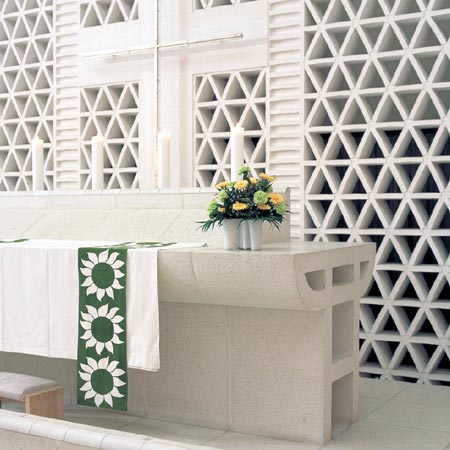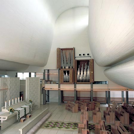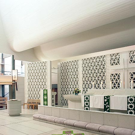 圣壇和洗禮池由已拋光的白色混凝土制成,它們與房間的氣氛相配,讓屋頂上的云彩和下面的圣會形成了一致