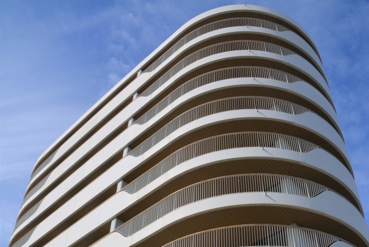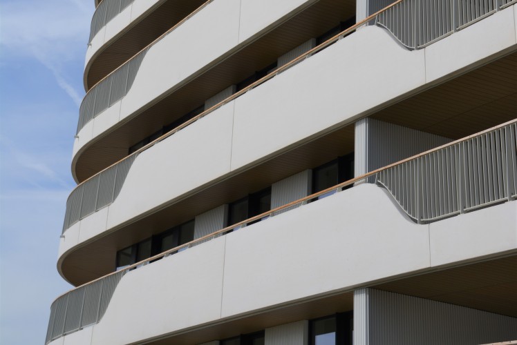 該建筑的設(shè)計(jì)是對(duì)現(xiàn)有白色河岸建筑的現(xiàn)代應(yīng)用和詮釋。白色鋁型材的外立面幕墻包裹著由C-Concrete生產(chǎn)的波浪狀白色混凝土陽臺(tái)?;诎柌?白